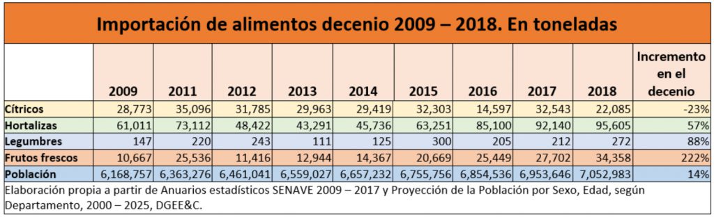 En el último decenio (2009-2018) la población del Paraguay creció 14%. Sin embargo las estadísticas oficiales dicen que la importación de alimentos básicos de la dieta de esta población creció mucho más: 57% las hortalizas, 85% las legumbres, 222% los frutos frescos, considerando solamente las cifras oficiales, ya que “importamos” legal e ilegalmente, más de la mitad de los vegetales que consumimos. Claramente esto no sucede porque comamos cada vez más, sino por la decreciente producción de alimentos en el país.
